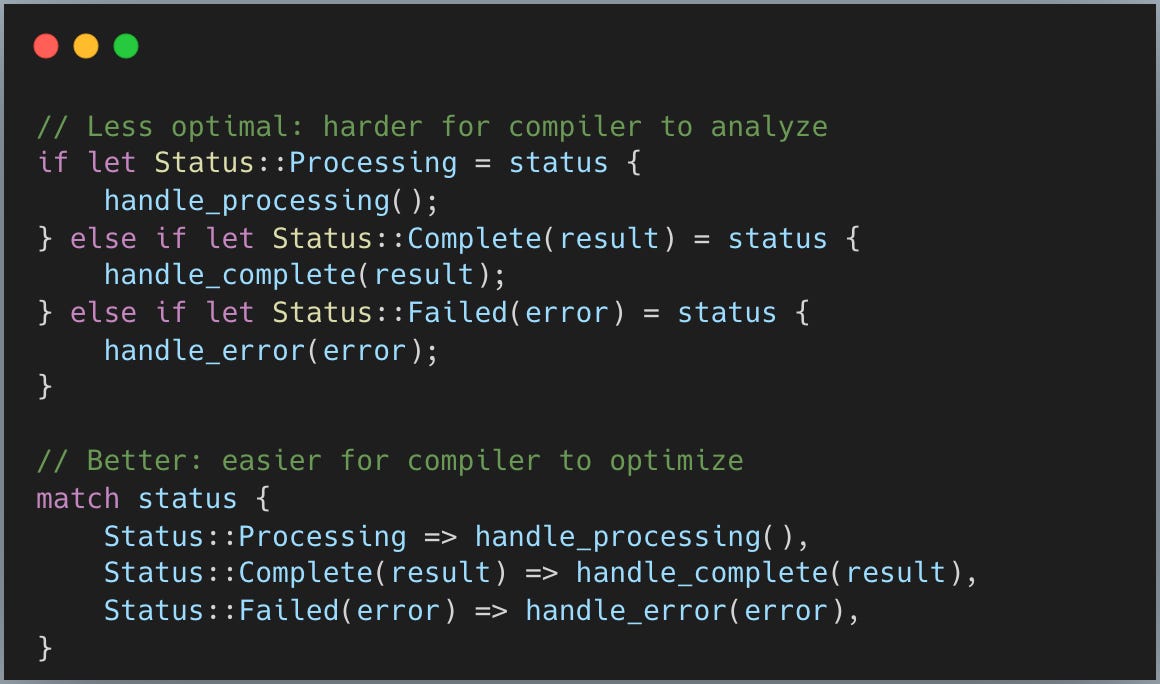 When handling enums, prefer match over if/else chains for better compiler optimization and exhaustiveness checking. While both approaches often compile to similar code in release mode, match gives the compiler more information to work with, and there are cases where if/else chains prevent certain optimizations that match enables.