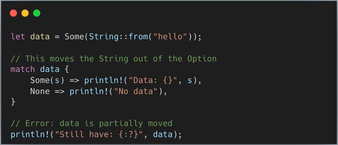 When we match Some(s), Rust transfers ownership of the String to variable s. This leaves data partially moved since the Option wrapper exists but its contents are gone. Rust prevents using partially moved values.