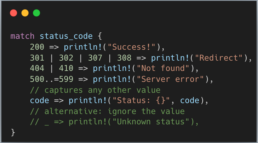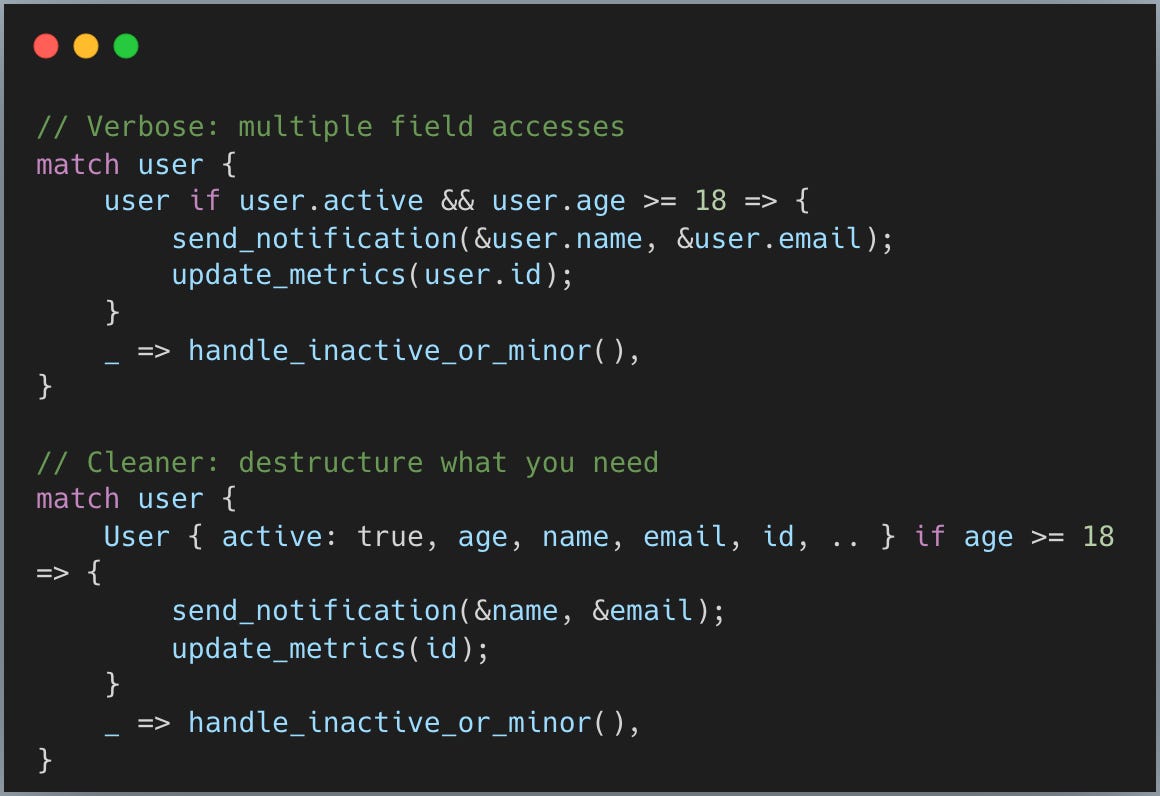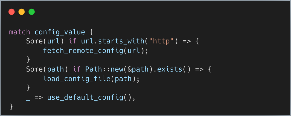 Important: Rust evaluates patterns first, then guards. The pattern extracts values (like url or path from Some), making them available for the guard condition. If the guard fails, Rust moves to the next pattern.