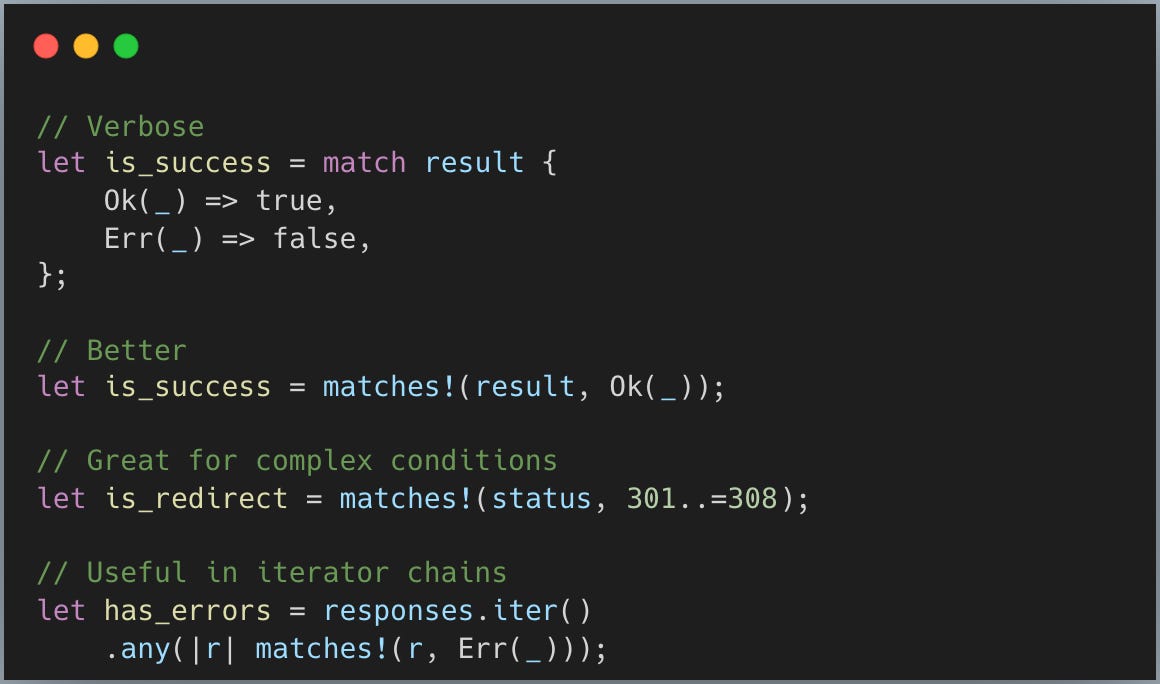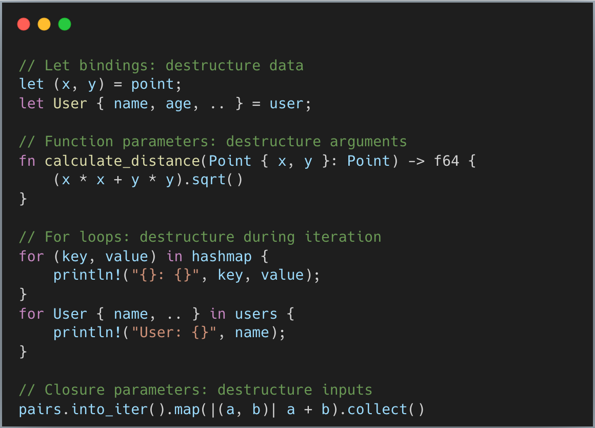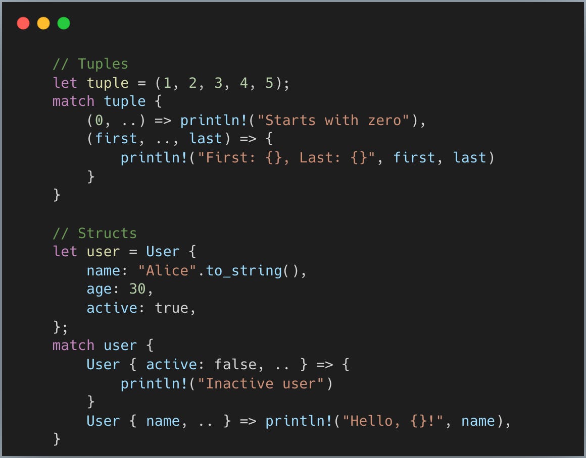 Rust’s pattern matching feels simple enough: match on enums, destructure tuples, handle Option and Result. I stuck with these basics for months because, well, they work. But there’s a whole world of pattern techniques I wasn’t using. Once I discovered what’s actually possible, I kicked myself for all the verbose code I’d written.