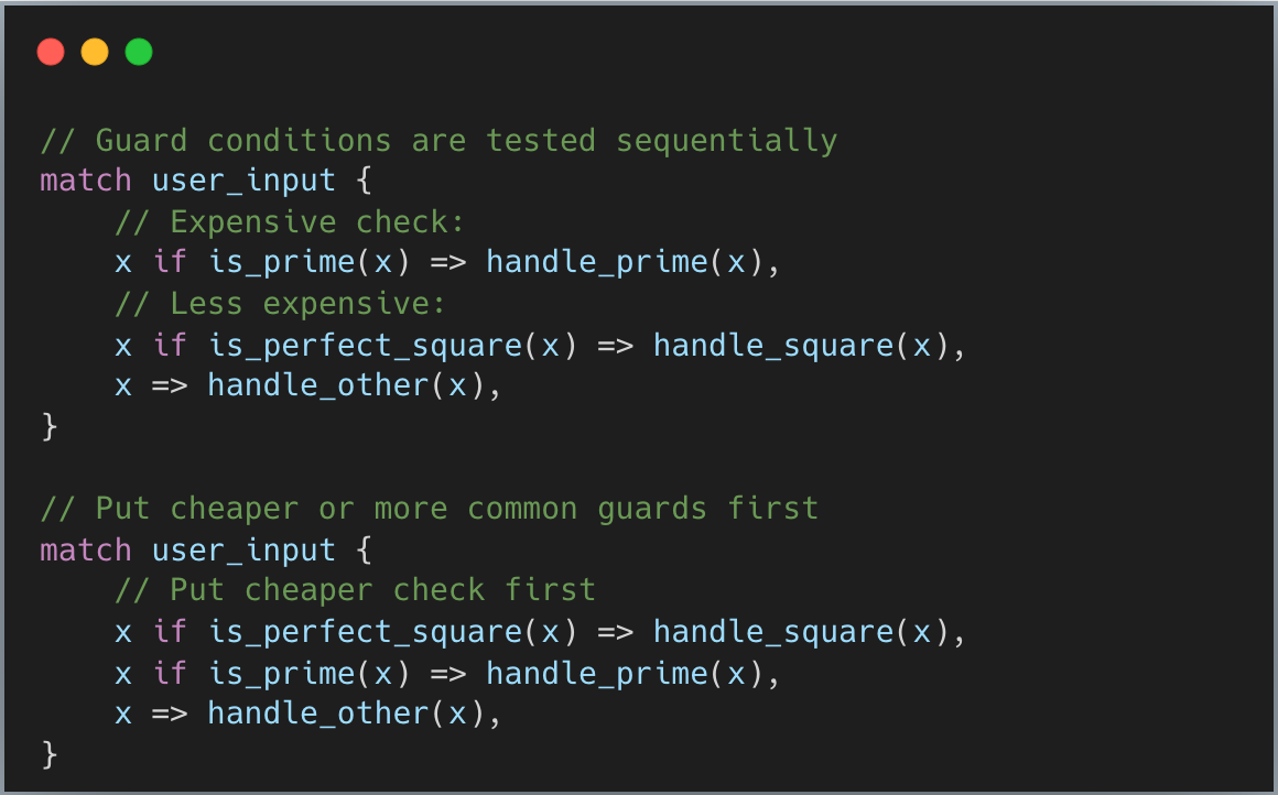 Note: For simple enum or integer matches, the compiler generates efficient jump tables regardless of arm order. So this rule doesn’t apply.