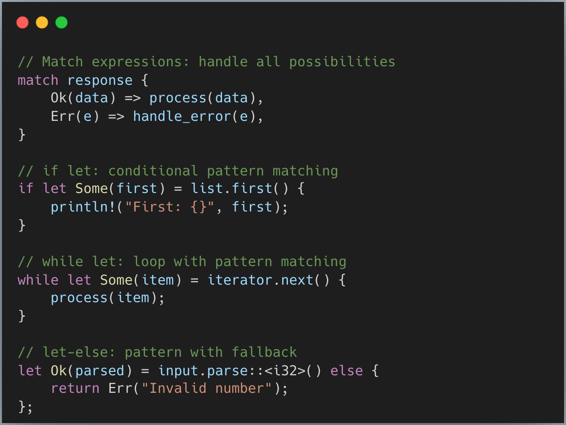 let-else is interesting. It’s relatively new (Rust 1.65). It requires the else block to diverge (it must return, panic!, or exit the function). This ensures the variable is definitely assigned if execution continues.