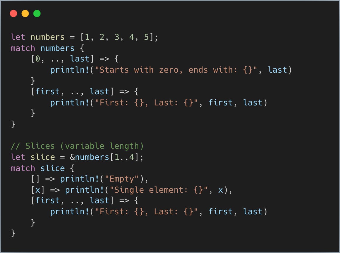 Notice the difference: The array match requires exactly 5 elements, while slice patterns adapt to any length. The .. matches however many elements are between the specified positions.