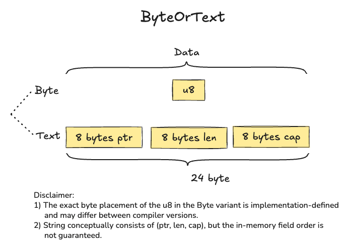 The magic: in a valid String, the pointer is never null. It always points to allocated memory. Rust exploits this by using the null pointer value as a signal meaning "this is actually the Byte variant, not the Text variant."