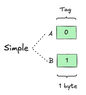 Important Note: These memory layouts show how the current Rust compiler typically arranges enums, but this isn't guaranteed to stay the same. With the default repr(Rust) representation, the compiler is free to change layout across different versions to optimize performance. You can rely on size_of::<T>() and align_of::<T>() for your compiled program, but the specific field arrangement and internal layout may change. Use these examples to understand concepts, not for low-level memory manipulation.