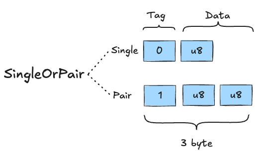 Since all components (u8 tag and u8 data fields) have 1-byte alignment, no padding is needed. The enum takes exactly 3 bytes: 1 for the tag plus 2 for the largest variant (Pair).
